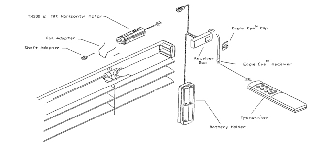 Note: The receiver includes both a white box and a remote Eagle Eye located on an 10" cable from the box. This eye must be in direct line of sight to the remote control. 1. Plug the white receiver box to the motor. Store any excess cable in the rail or as appropriate. 2. There is approximately 10" of wire from the receiver box to the motor. (If more wire is necessary, consult your supplier for receiver extension cables available in 19" and 59") Position the receiver box anywhere desired. • Recommendations - behind the headrail; behind the valance... • Before removing the double-sided tape and mounting the receiver box in the desired location, clean the area with rubbing alcohol to ensure a more secure placement. 3. Position the Eagle Eye so that the eye is visible to the remote control. Use the Eagle Eye clip provided to affix the cable to secure the position of the Eagle Eye. Once again, the clip is installed using double-sided tape and the area must be clean. • Recommendations - over the top of the rail, behind the valance; etc. • Prevent direct sunlight or lamp light from falling on the Eagle Eye receiver. 4. Locate the battery holder in any position desired up to 59" from the receiver box. • Recommendations - screwed or taped to the wall; under the window's sill; behind a top or side treatment.... • The clear plastic battery holder may be installed as is with screw; or the double-sided tape provided. If using the double-sided tape, ensure the area is cleaned using rubbing alcohol. If desired, the white battery holder cover can be snapped onto the battery holder. 5. Insert four AA batteries in the battery holder. Use alkaline batteries only. 6. Snap the battery connector from the receiver to the battery holder. Store the excess wire in the battery holder case or in the rail. (The battery holder comes standard with 59" of wire. There are no extension cables available.) Note: Install the blind per the enclosed directions. The blind should still be in the raised and locked position. Make sure the blind is well aligned and installed with all brackets. Install the valance and Eagle Eye to the valance, if desired lower the blind. If necessary, you can position the Eagle Eye at this time and proceed though steps 2-6. During installation, make sure the automated blind is well-aligned and installed without any stress to effect the torque for tilting. II. Programming the receiver to the remote control: 1. Overview of your remote control: Using your remote control, you can: • Operate three blinds individually. • Operate an unlimited number of blinds by grouping them into one of three channels. The three programmable channels allow you to operate up to three groups of one or more blinds. • Operate all your blinds simultaneously with the select all channel (channel 4). Operation: • You can use channels 1,2, or 3 to tilt the blind(s). The tilting movement of the blinds will either stop when the key is released or when the blind can be tilted no further. • The last channel (4) always operates all of the blinds and does not require any programming. 2. Programming the remote control's channel to the receiver: Install two AAA batteries in the remote control. Use alkaline batteries only. Be sure to program each blind immediately following the installation of each automation system. Once the batteries are installed in the battery holder, the blind is ready to be programmed. IMPORTANT: Because the remote control signal is so strong, if you attempt to program a number of blinds on individual channels at one time, the blinds will only program to one channel. To avoid this situation, only connect the batteries to the blinds to be programmed to the first signal, then connect the batteries to the blinds for the second signal, etc. The first channel you press (1,2 or 3) is the channel you have assigned to operate that blind. Once you have assigned the receiver's channel, the blind is automatically programmed to operate from that channel only and will not respond to other channels except channel 4 which operates all blinds. Several blinds can be programmed to operate from the same channel, for example, all blinds on one side of a room can be assigned the same channel. Note: If you decide to re-program a blind to a different channel, this can be accomplished by removing the batteries from the receiver battery holder for five minutes, then re-installing the batteries and reprogramming the blind. Reprogramming is required when replacing the battery holder batteries. III. Troubleshooting: If your motorized blind does not operate • If your remote control does not operate, check whether the blind is programmed to respond to the channel you pressed. Also, check for correct battery installation. If necessary, replace the remote control batteries. • If a blind does not operate, check for correct battery installation of the batteries in the battery holder, wire connections, or reprogram as described in section VI. If necessary, replace battery holder batteries. • Check that the shaft adapter is inserted tightly onto the tilt shaft. • Check that there is no direct light on the Eagle Eye receiver. If your blind still fails to operate, contact Customer Service at Updating |